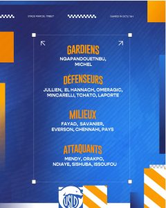 18 joueurs convoqués, Théo Sainte-Luce et Yaël Mouanga blessés sont hors du groupe, Khalil Fayad et Ayanda Sishuba présents. On notera l’absence de Nathanaël Mbuku qui revient de sélection.
