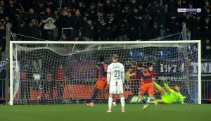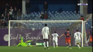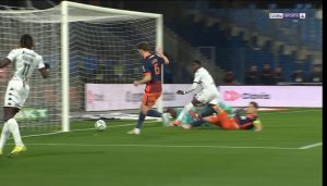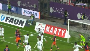On change de côté, centre vers Mendy et MAIN !!!! PENALTY. Oui oui! 45+4 et l’arbitre désigne le point de penalty pour le MHSC, une minute après avoir été proche d’être mené, Mendy inscrit en force, sous la barre le but du 2-1 !!!!!